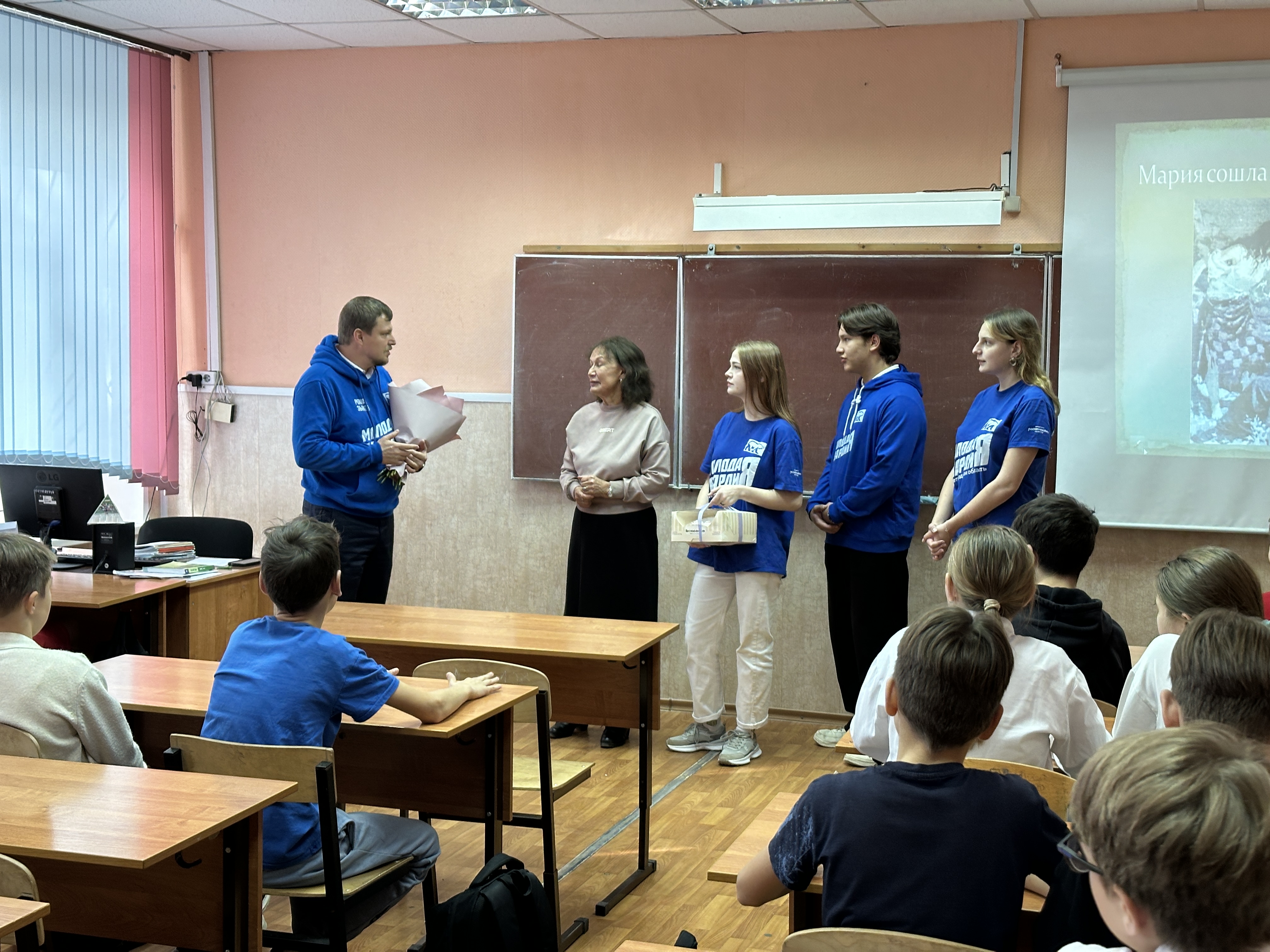 Молодогвардейцы поздравили учителей адресно и в школах, а также возложили цветы в память о погибших работниках образования.