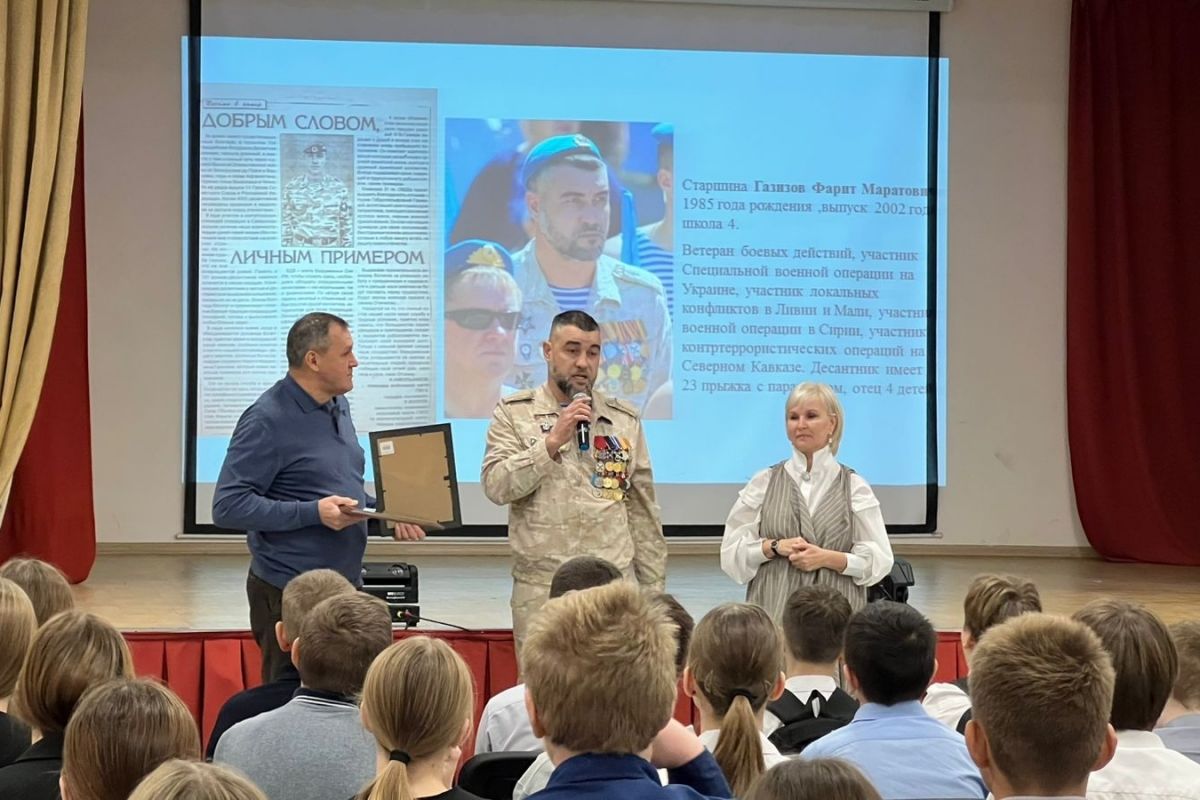 В школе №4 старшина, выпускник образовательного учреждения Фарит Газизов рассказал о своей службе, показал боевые награды и ответил на вопросы ребят.